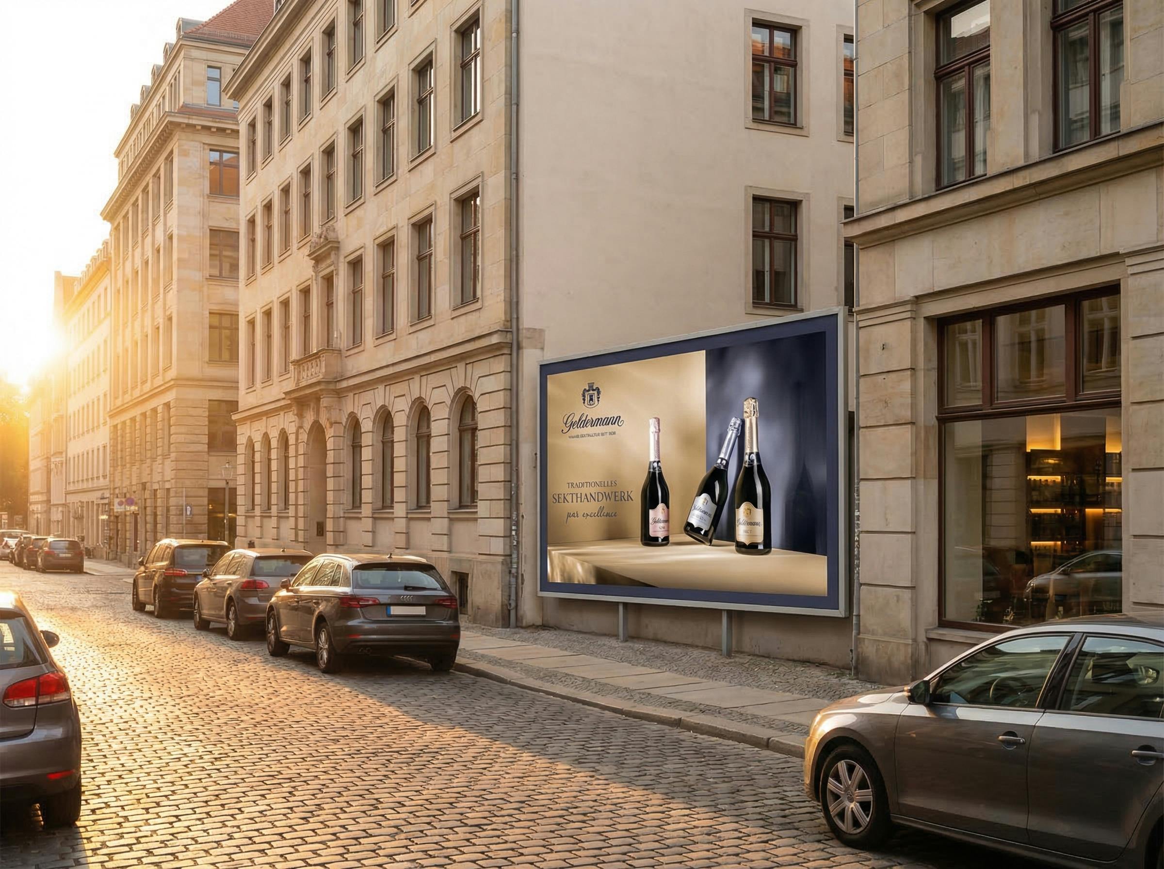 Gemeinsam mit Geldermann haben wir deshalb eine Kampagne entwickelt, die genau diese Haltung sichtbar macht. Sekt nicht nur als Produkt, sondern als Teil einer lebendigen Genusskultur. Im urbanen Raum. Out of Home mit Litfaßsäulen und Plakaten, platziert rund um Kulturveranstaltungen in ausgewählten Städten.