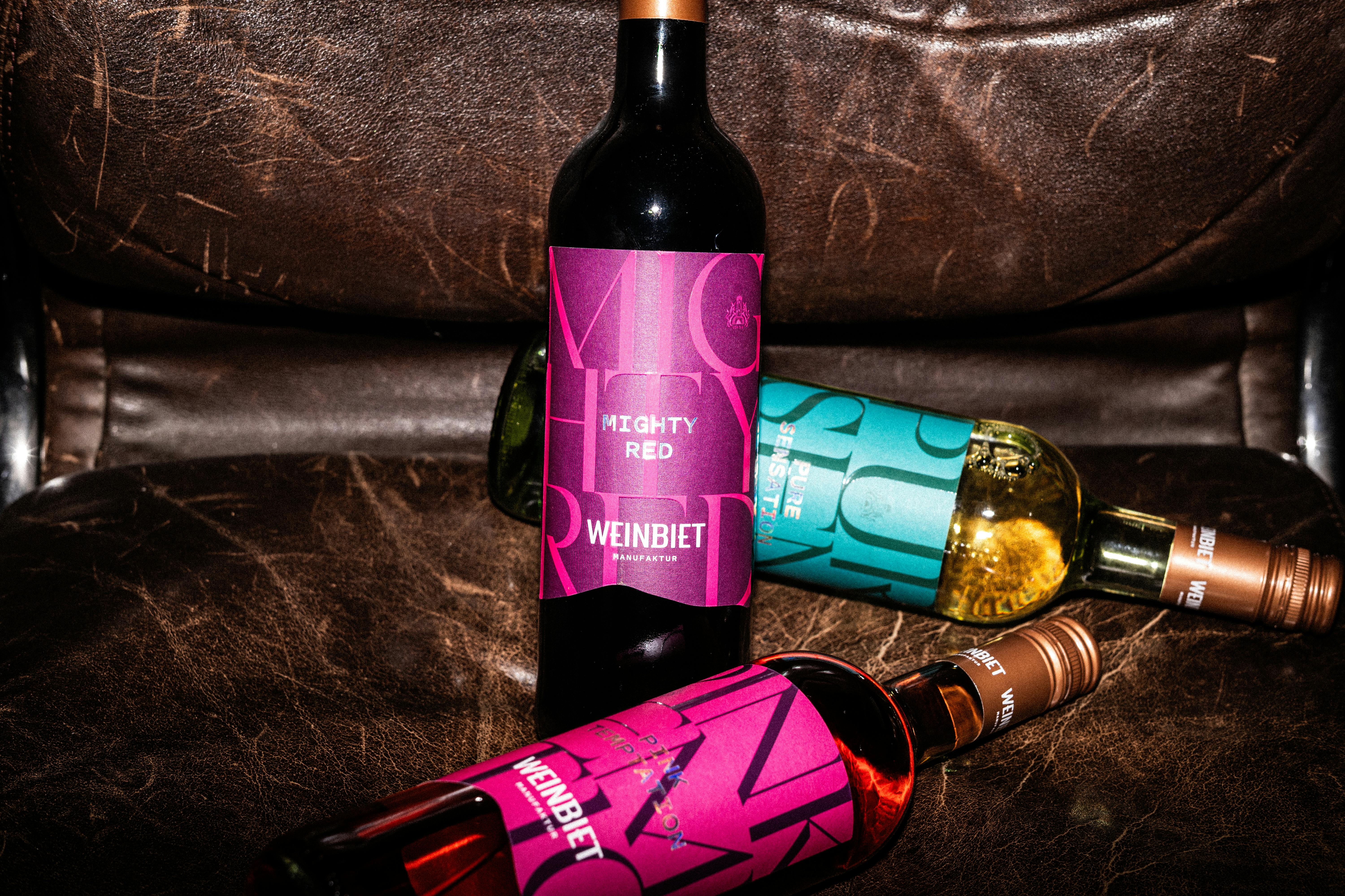 Wein muss nicht immer alles erklären. Warum so kompliziert? Manchmal darf er einfach schön sein und richtig gut schmecken. Für genau diese Zielgruppe haben wir bei Yummy Stories, Designagentur und Markenagentur für Weinmarken, gemeinsam mit Weinbiet die Category Mighty Red, Pink Temptation und Pure Sensation entwickelt. Eine Weinkollektion, die bewusst mit klassischen Weinmustern bricht. Easy drinking statt Wein Blabla. Selbstbewusstes Packaging Design statt museale Gestaltung mit Goldkante. Ein expressiver Auftritt, der näher an Fashion und Lifestyle liegt als an klassischer Weininszenierung.